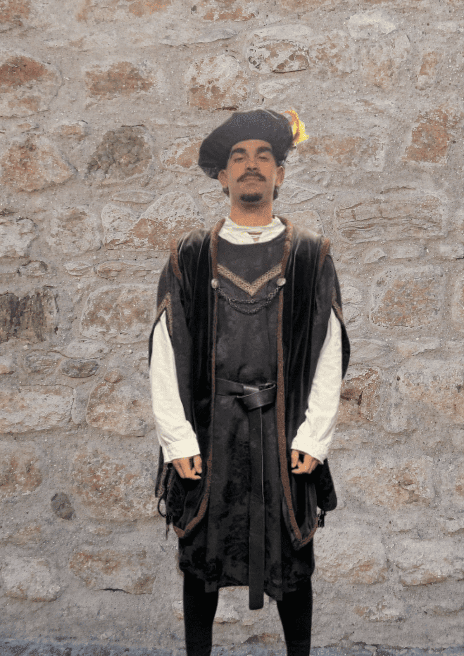 Este traje inclui camisa, gibão, calça, colete, cinto de pele, bolsa de pele/pano e boina.