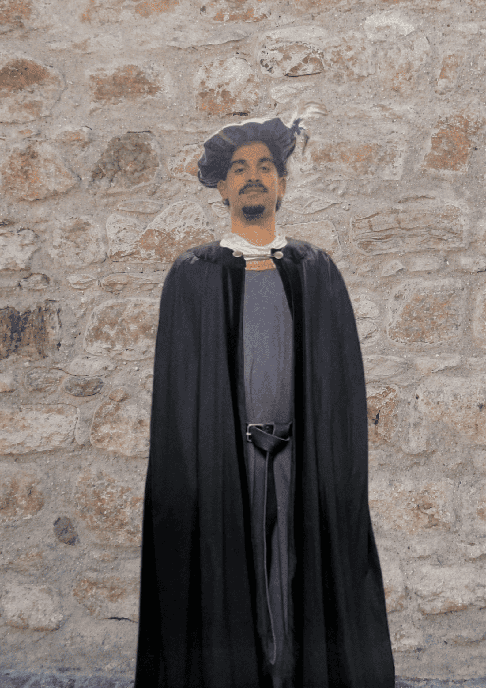 Este traje inclui colete, boina, túnica, calça , cinto de pele e bolsa de pele/pano.