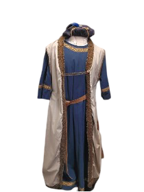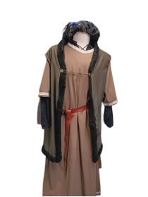 Este traje inclui colete, boina, túnica, calça , cinto de pele, bolsa de pele/pano.