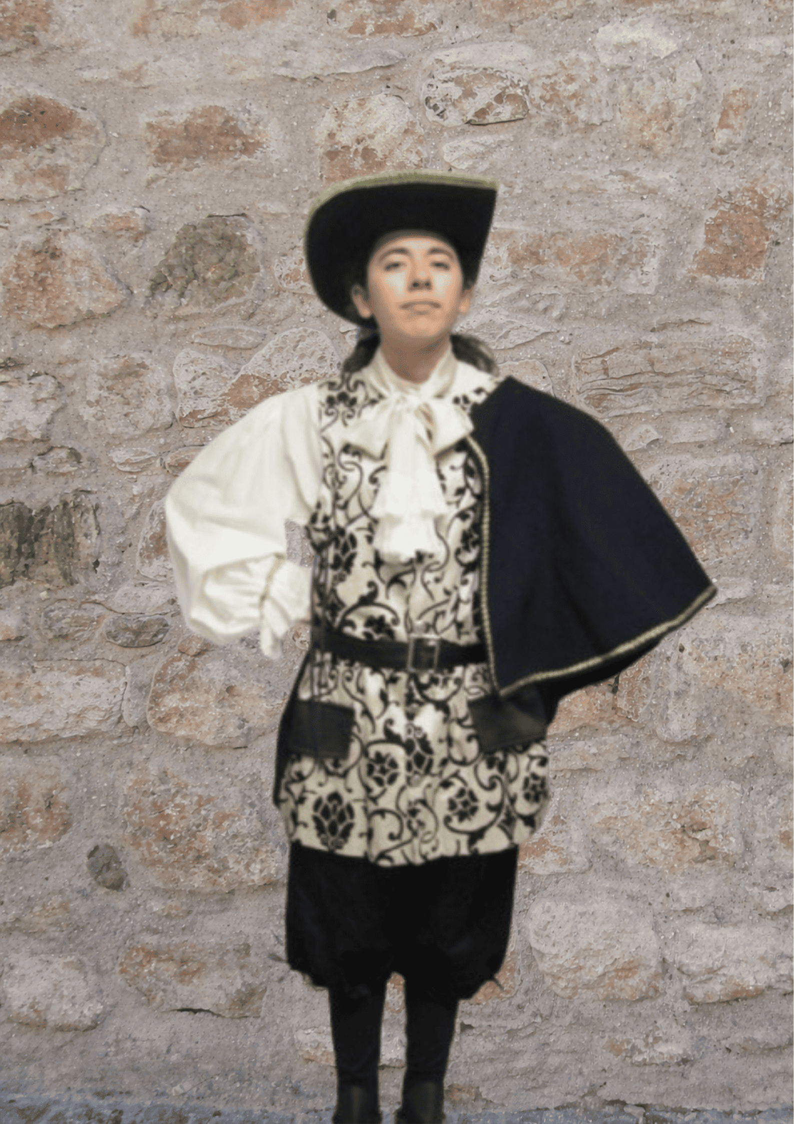 TRAJE COMPOSTO POR CAMISA COM RENDAS , CALÇÃO, CINTO , VESTIA ADAMASCADO (COLETE), CAPA , CHAPÉU E JABOU COM RENDAS