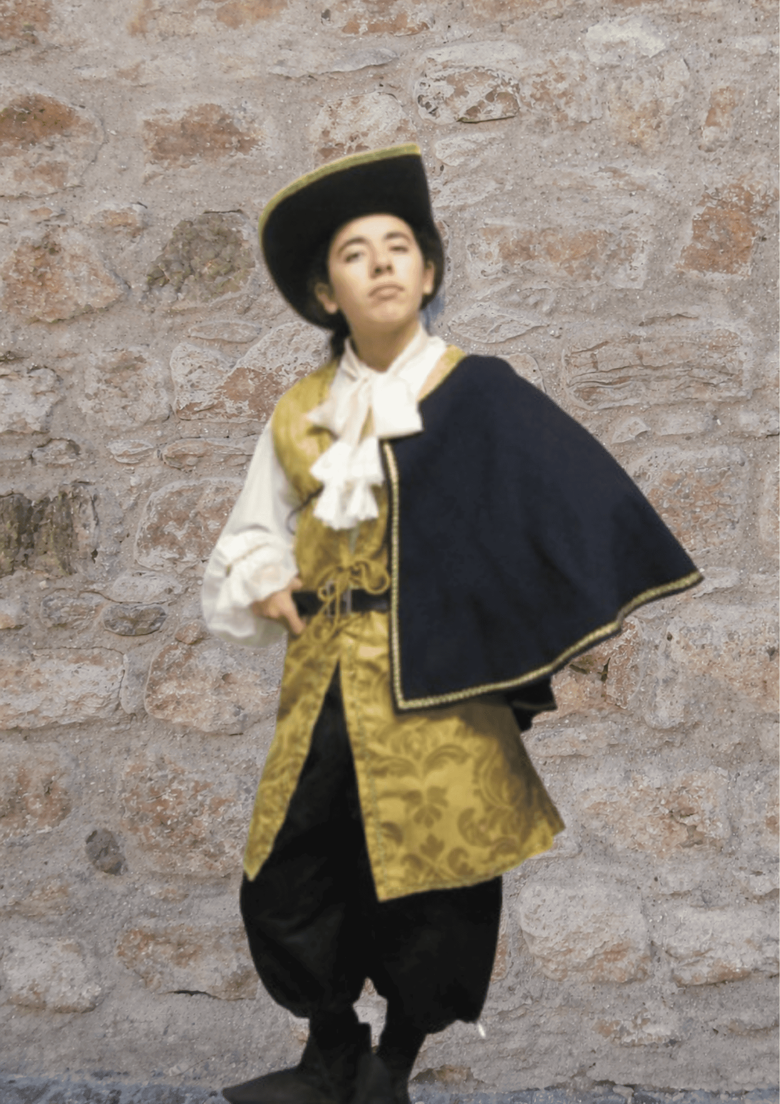 TRAJE COMPOSTO POR CAMISA COM RENDAS , CALÇÃO, CINTO , VESTIA ADAMASCADO (COLETE), CAPA , CHAPÉU E JABOU COM RENDAS