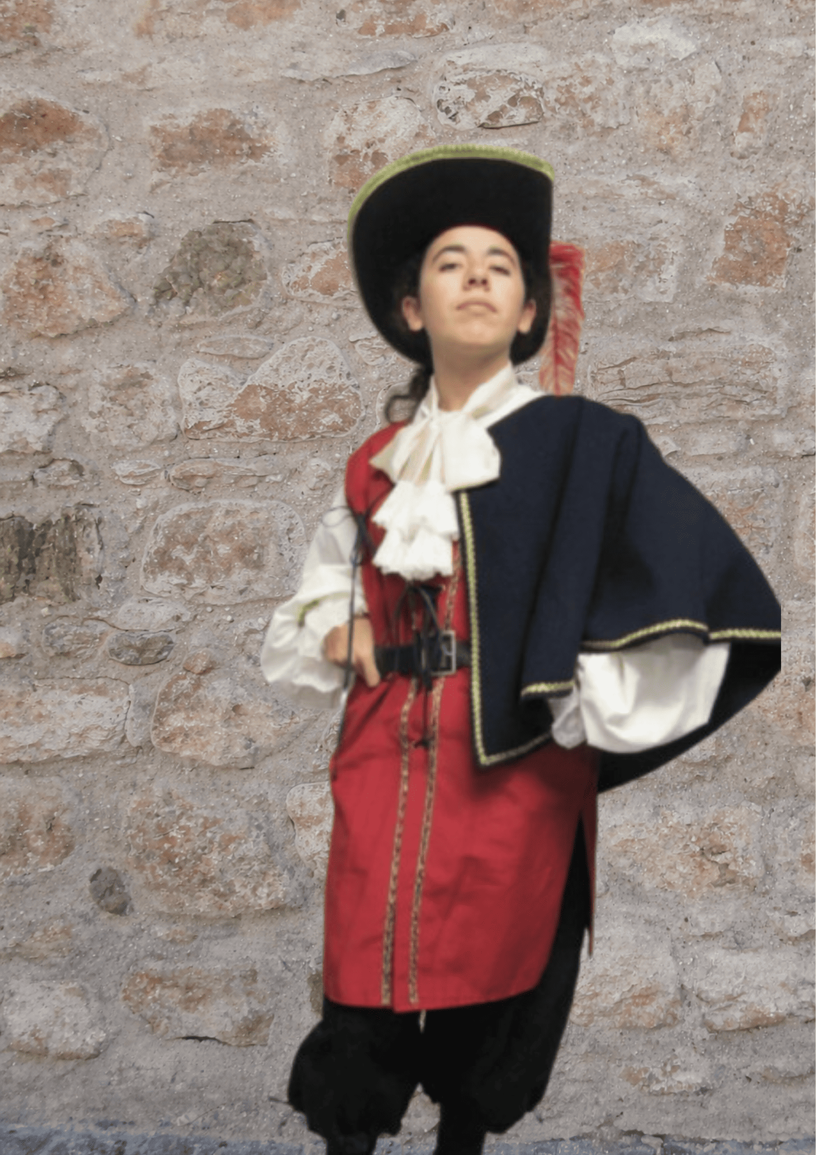 TRAJE COMPOSTO POR CAMISA COM RENDAS , CALÇÃO, CINTO , VESTIA ADAMASCADO (COLETE), CAPA , CHAPÉU E JABOU COM RENDAS
