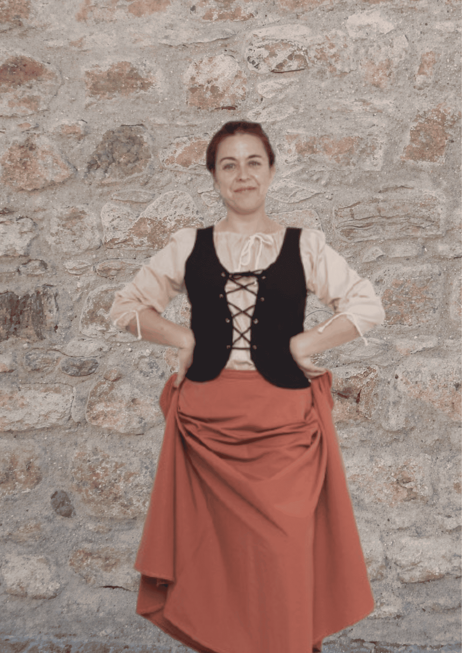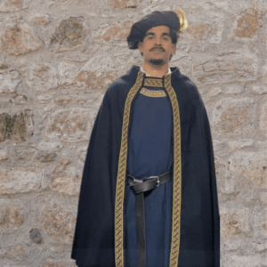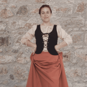 Este traje inclui camisa, colete, saia e coroa.
