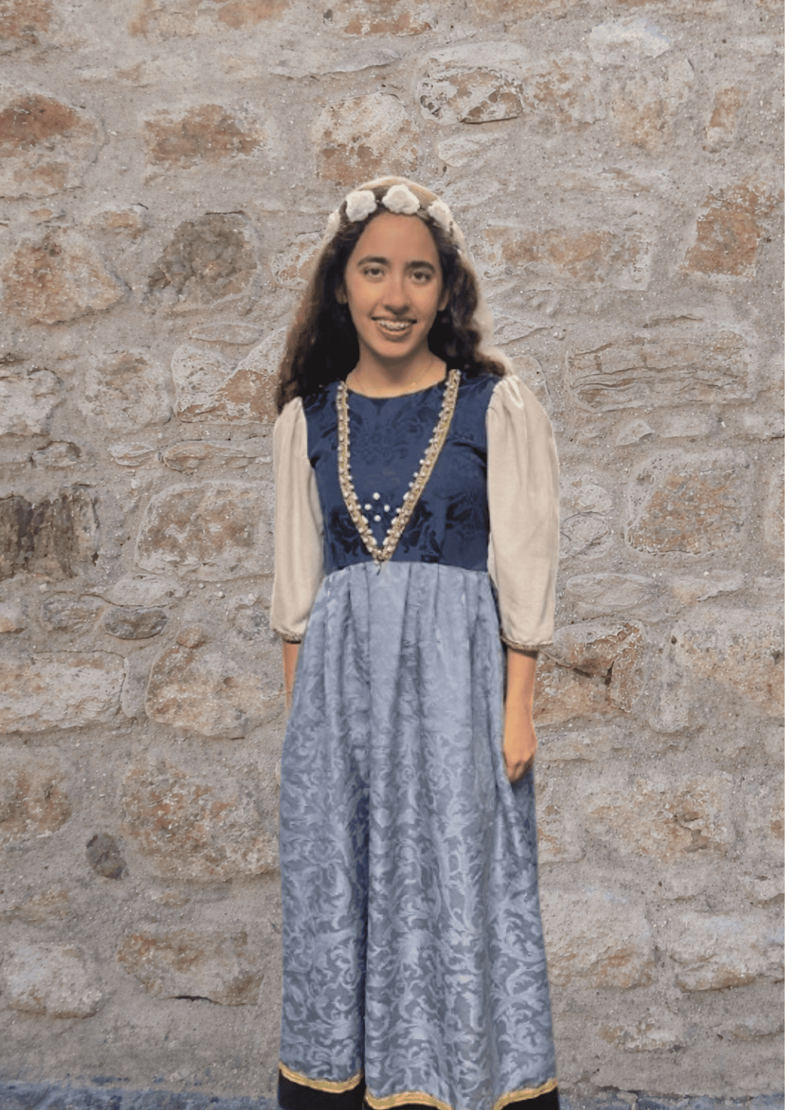 Este traje inclui o vestido, bolsa de pano e coroa/toucado.