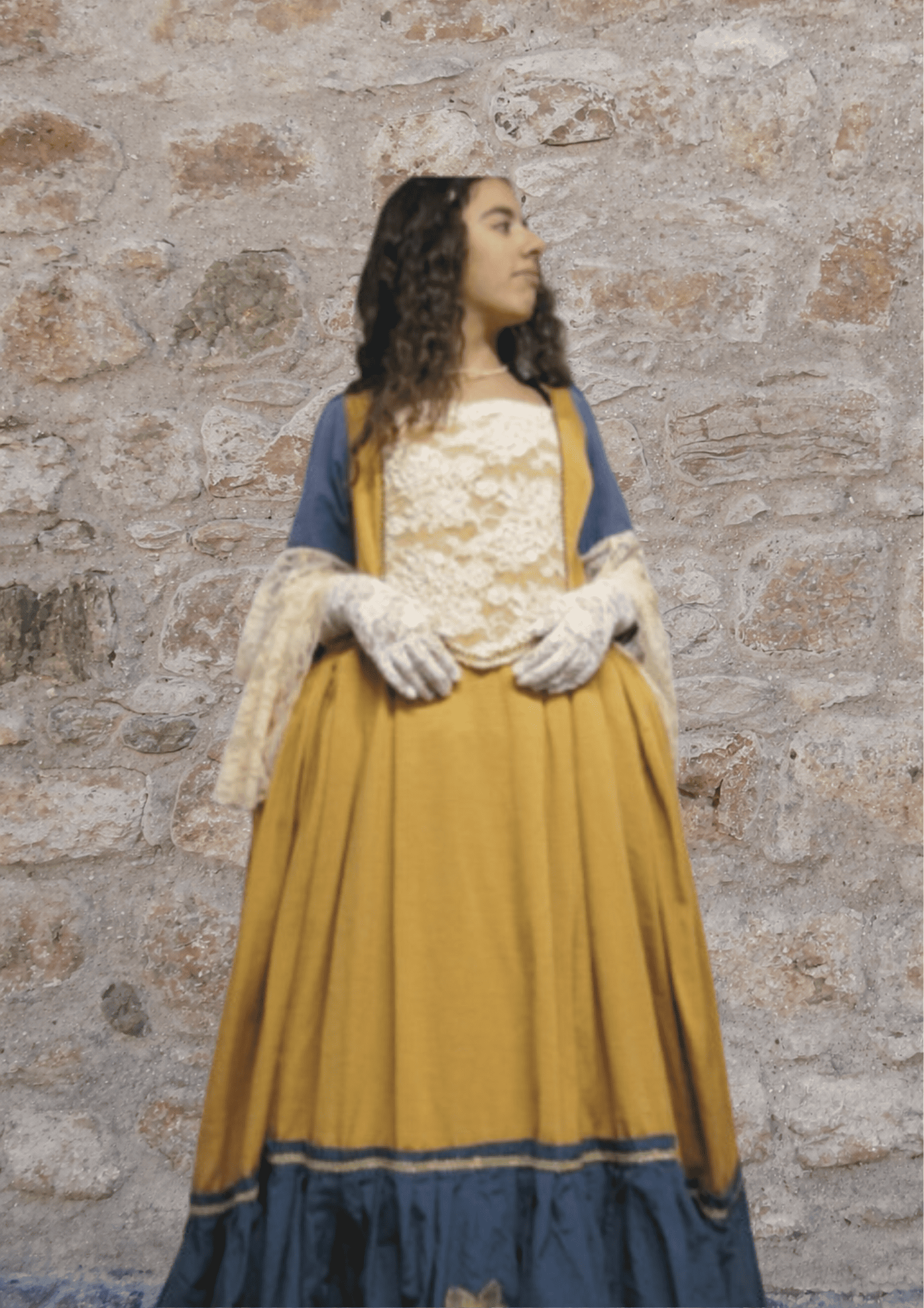 VESTIDO EM CAMEL E AZUL COM RENDAS PEROLA COM SAIOTE COM AROS INCLUIDOS